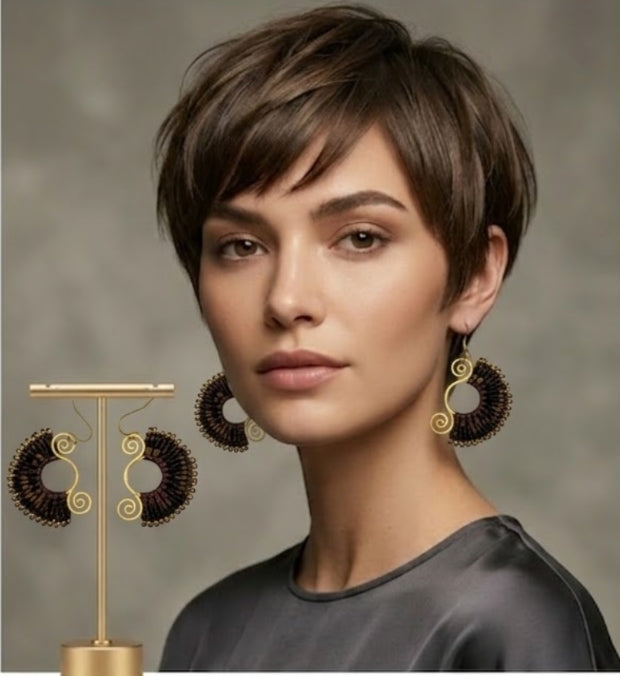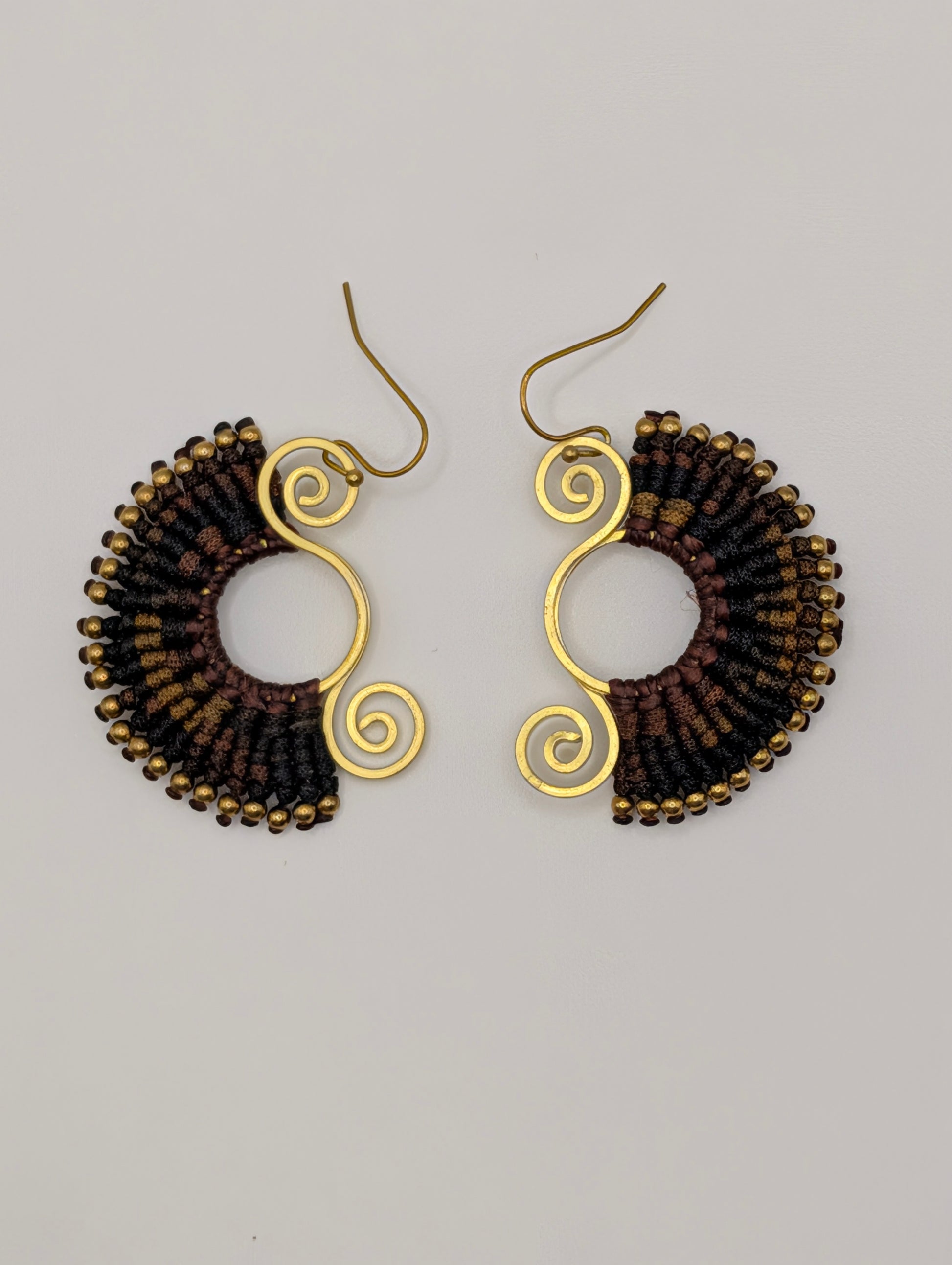 Inspired by a waning crescent moon, these unique statement earrings feature intricate, hand-woven fringe in a moody blend of deep espresso and black. The dark, rich cotton waxcord texture is framed by a bold golden brass spiral that adds a touch of bohemian-luxe to the look.