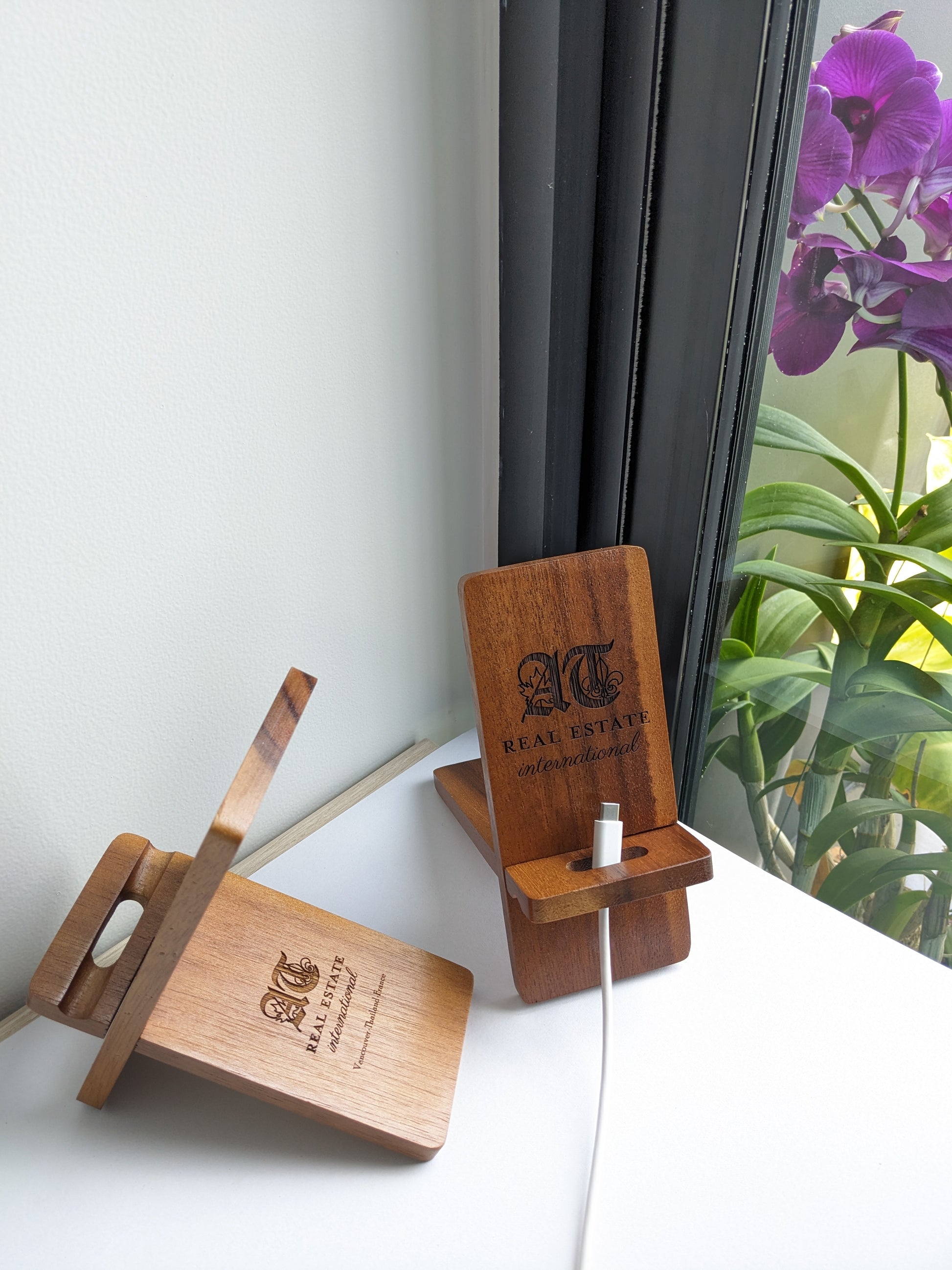 Handcrafted from sustainable wood, it features a precisely cut slot to manage your charging cable neatly. Use it to hold your phone vertically or horizontally for watching videos.