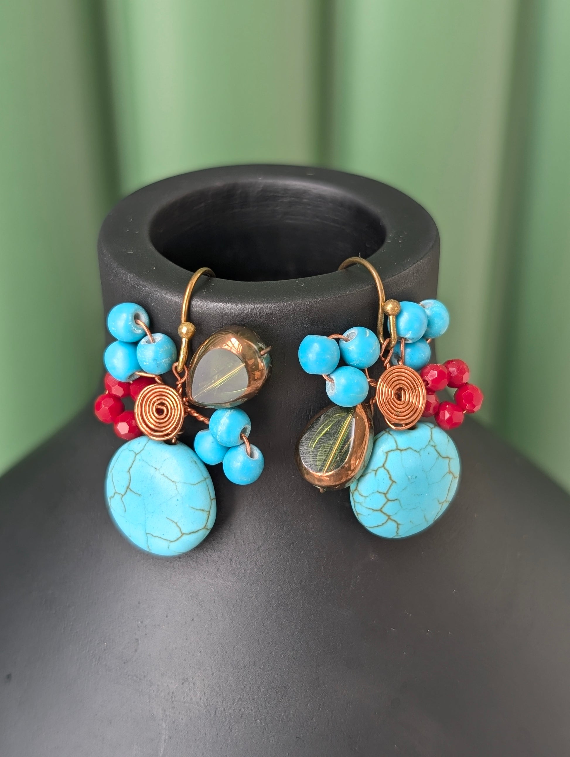 A vibrant pair of handcrafted earrings featuring striking turquoise stones accented with coral and earthy beadwork. Each piece is uniquely designed with delicate floral-inspired clusters, bringing a bold yet elegant statement to any look. Lightweight, artistic, and truly one of a kind.